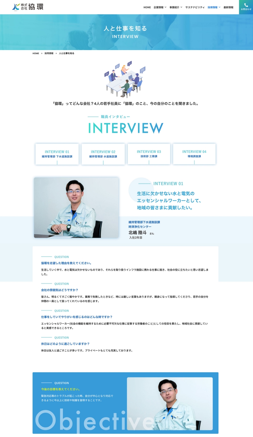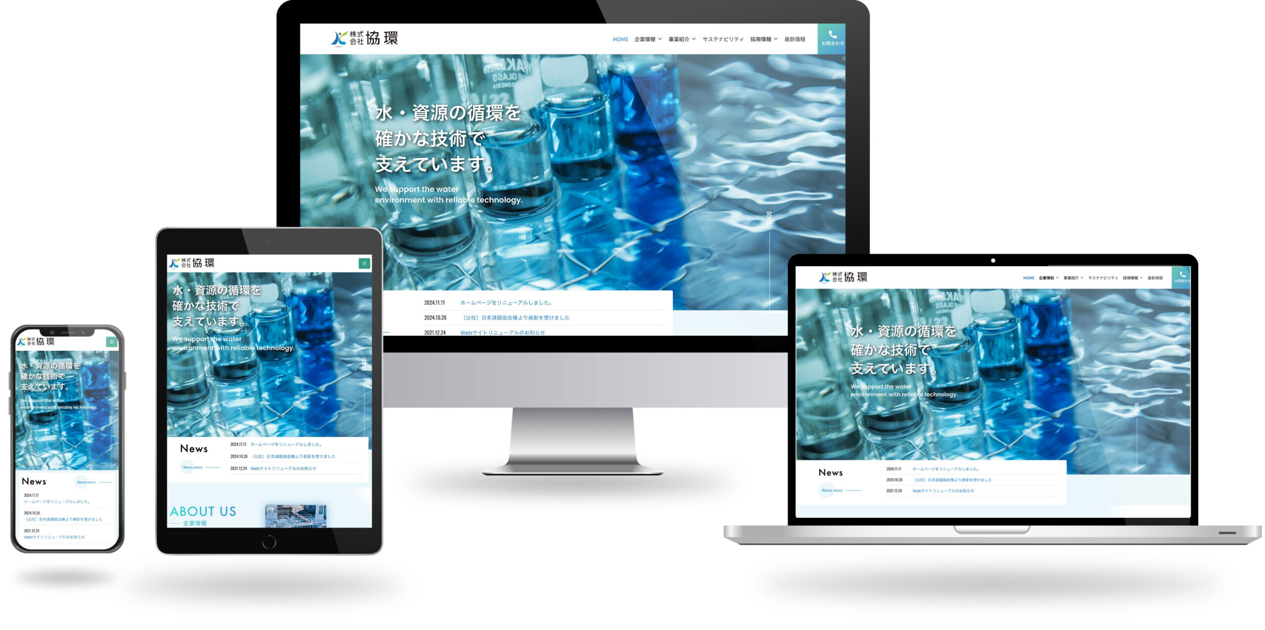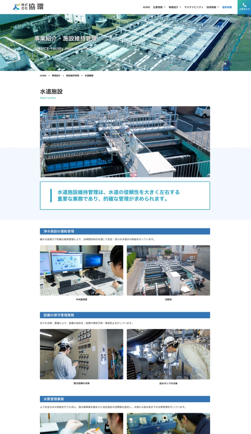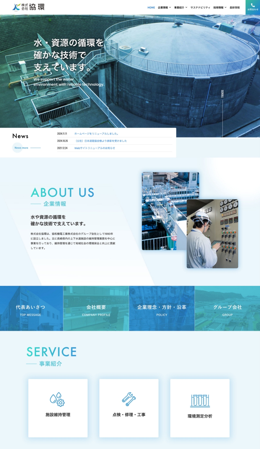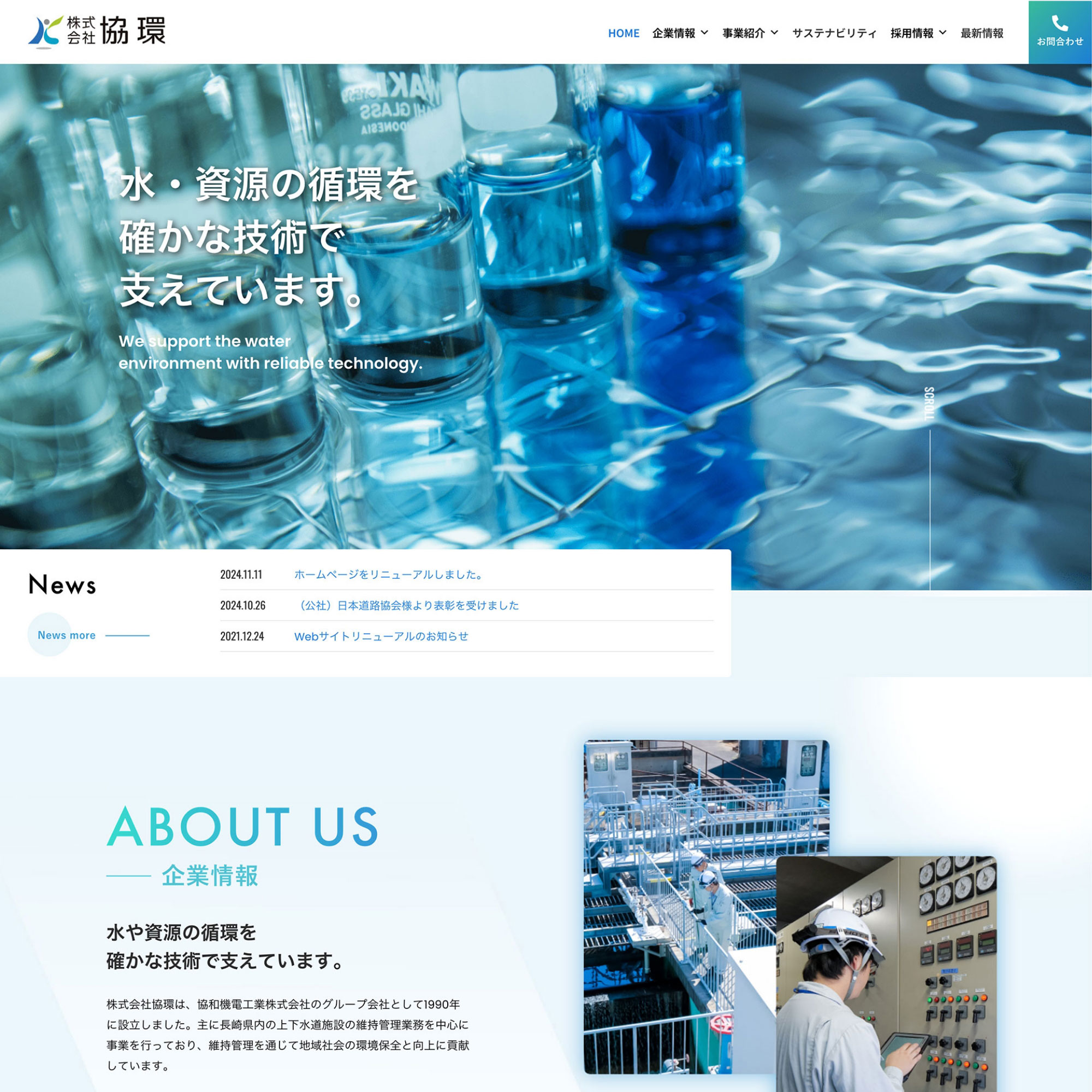 株式会社協環様(長崎市)のWebサイトをリニューアルいたしました。水処理施設の維持管理・水質調査といった事業内容をわかりやすく紹介する構成に再設計し、採用ページも職場の雰囲気や働く魅力が伝わるよう充実化。プロカメラマンによる写真・動画撮影や会社案内パンフレットの制作まで一貫して対応し、多方面からの情報発信をトータルでサポートいたしました。